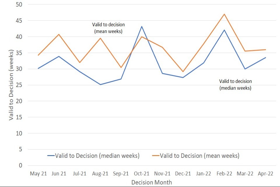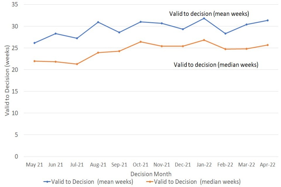 The decisions made in a given month will include those that started many months before, and thus do not give an accurate indication of how long decisions submitted, or deemed ‘valid’ in that month, will take.