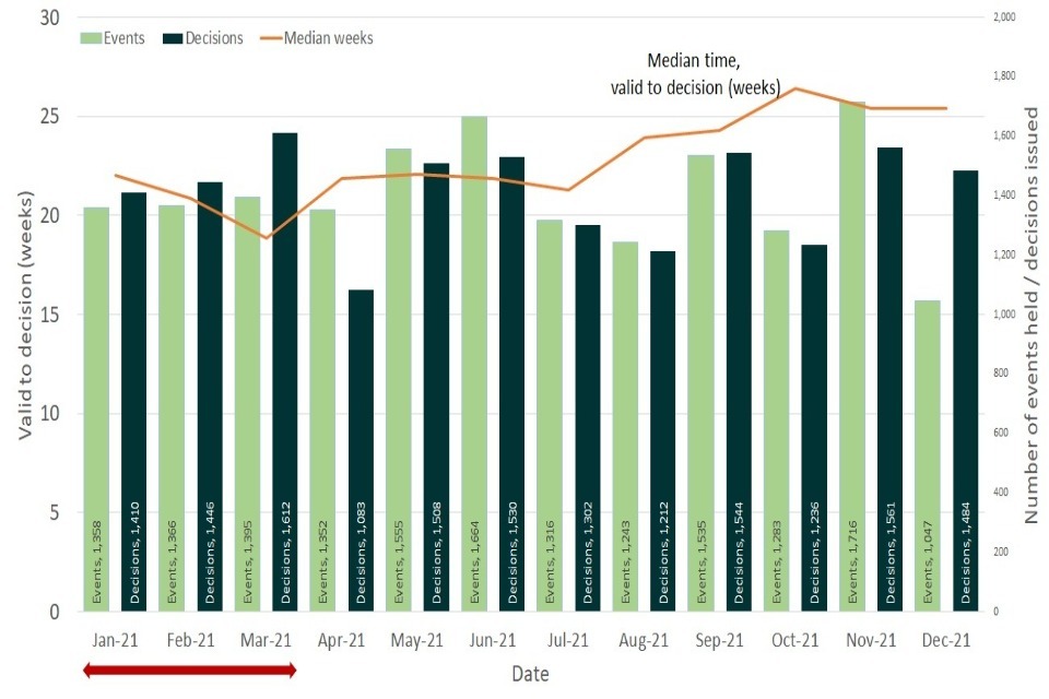 Figure 1: Number of events held , decisions issued and median time between valid date & decision date; Jan-21 to Dec-21