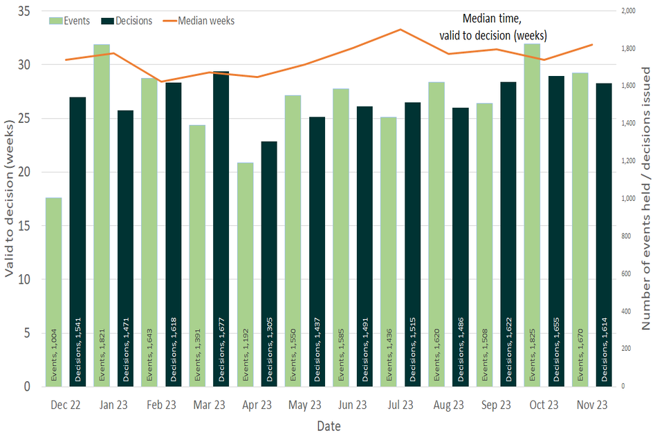 Figure 1: Number of events held , decisions issued and median time between valid date & decision date; December 2022 to November 2023.