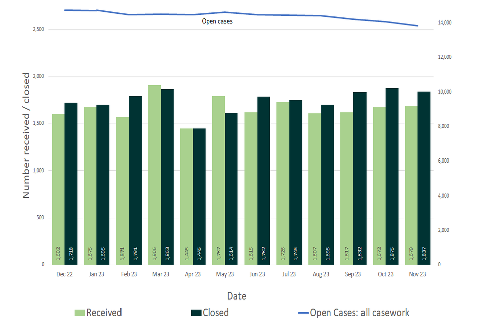 Figure 2: Number of cases received, closed and open; December 2022 to November 2023.