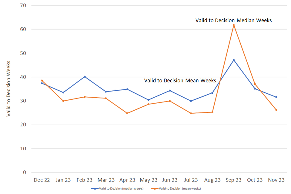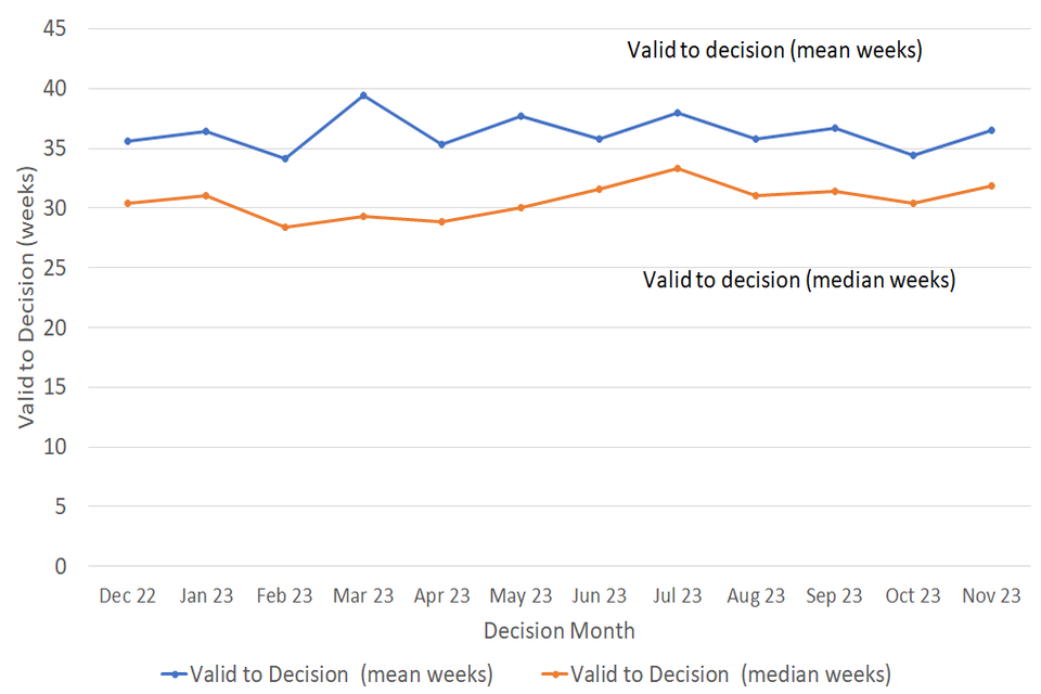 The median valid to decision time was 32 weeks in November 2023, as seen in Figure 1 and Table 1 below. The median valid to decision time has risen slightly (1.5 weeks higher than October).