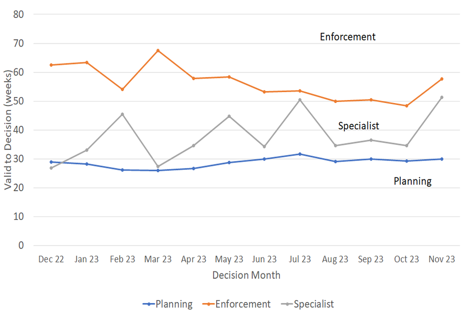 The median time for planning cases was 30 weeks in November 2023. The 12 month median was 29 weeks.