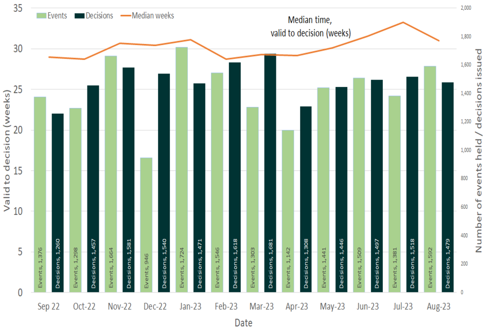 Figure 1: Number of events held , decisions issued and median time between valid date & decision date; September 2022 to August 2023.