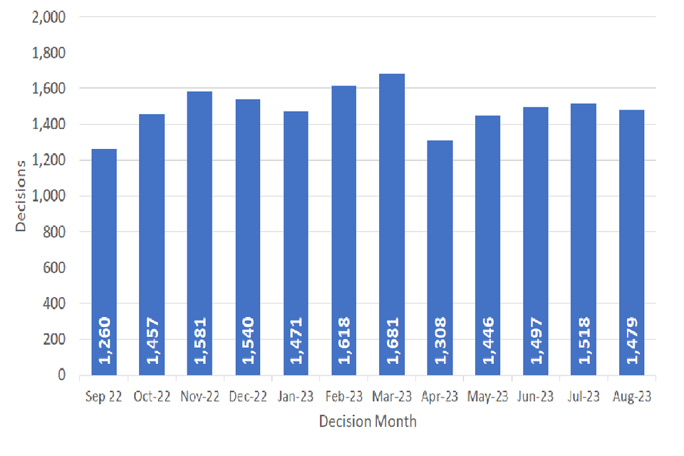 The number of decisions issued in August 2023 was 1,479, with a monthly average of 1,488 over the past 12 months.