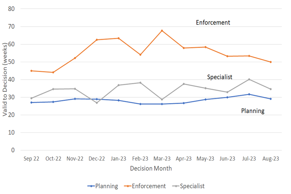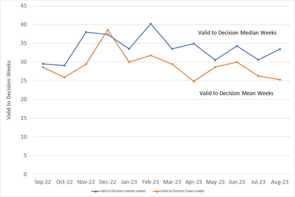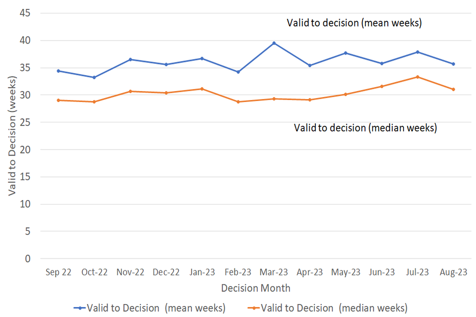 The median valid to decision time was 31 weeks in August 2023, as seen in Figure 1 and Table 1 below. The median valid to decision time has fallen for the first time in the past 3 months (2.3 weeks lower than in July).
