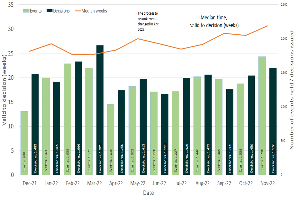 Figure 1: Number of events held , decisions issued and median time between valid date & decision date; December 2021 to November 2022.