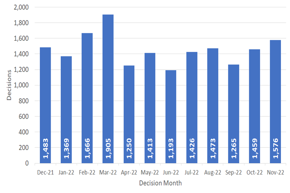 The number of decisions issued in November 2022 was 1,576, over 100 more than the average number of decisions per month over the past 12 months.
