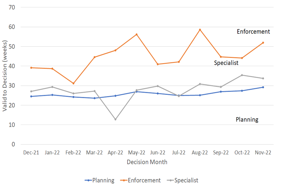 There has been a steady rise in the median valid to decision time, infrom 25 weeks in December 2021 the median average time to decision was was 25 weeks this has rise by 6 weeks to 31 weeks in November 2022, as seen in Figure 1 and Table 1 below.