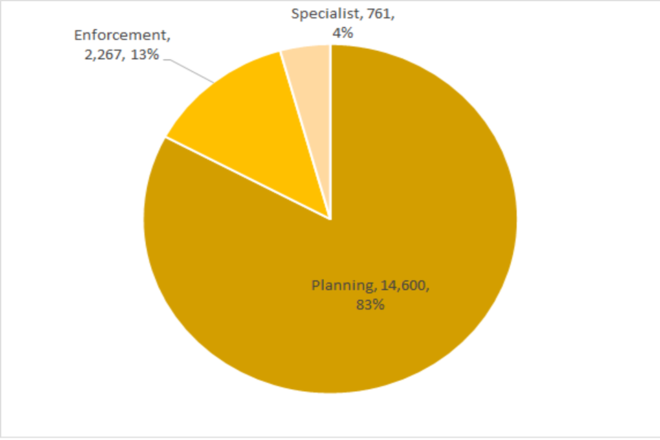 The large majority of cases over the past 12 months were planning (14,600). This is about eighty-three per cent of all appeal decisions made. There were 2,267 enforcement decisions and 761 specialist decisions. These totals are also shown in Table 4 above and Figure 4 below.
