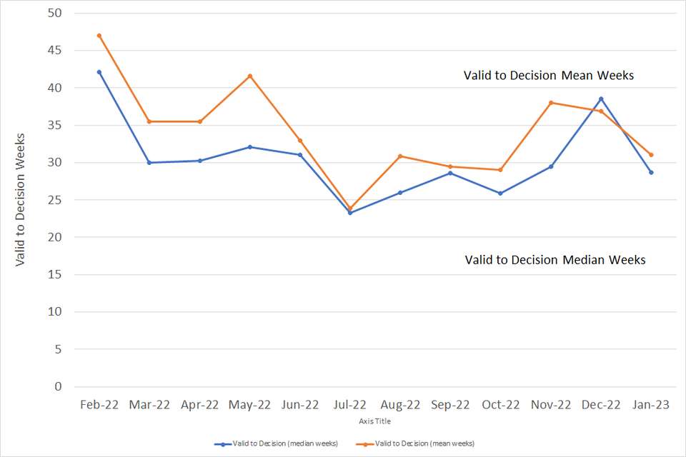There has been a rise in the median valid to decision time, from 25 weeks in February 2022 to 31 weeks in January 2023, as seen in Figure 1 and Table 1 below.