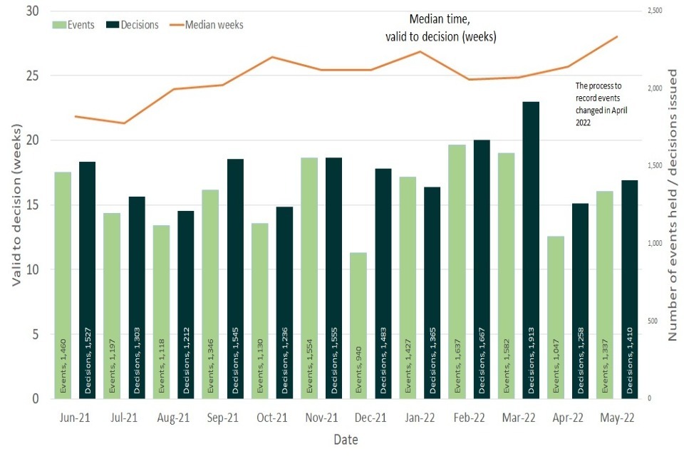 Figure 1: Number of events held , decisions issued and median time between valid date & decision date; June 2021 to May 2022.