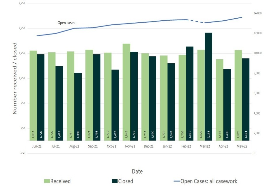 Figure 2: Number of cases received, closed and open; June 2021 to May 2022