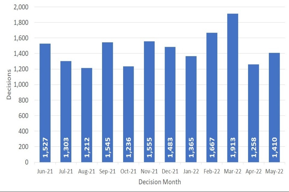 There were 665 decisions made on hearings during the last 12 months, and during May 2022, 87 decisions were issued. Pre-pandemic levels for hearing decisions were between 50 and 100 decisions per month.