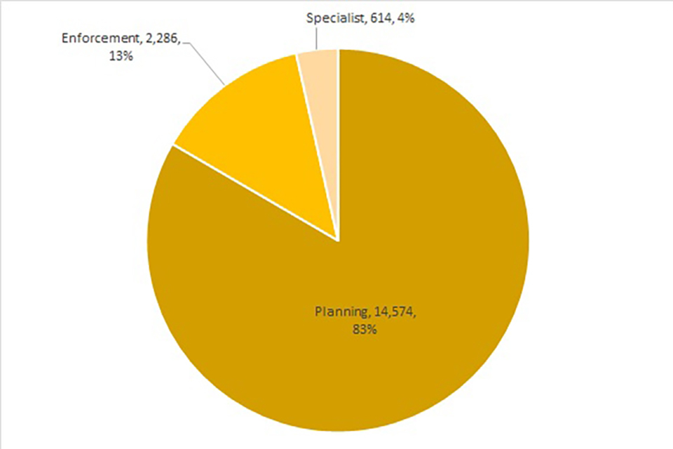 The large majority of cases were planning (14,574). This is about eighty-three per cent of all appeal decisions made. There were 2,286 enforcement decisions and 614 specialist decisions. These totals are also shown in Table 4 above and Figure 4 below.