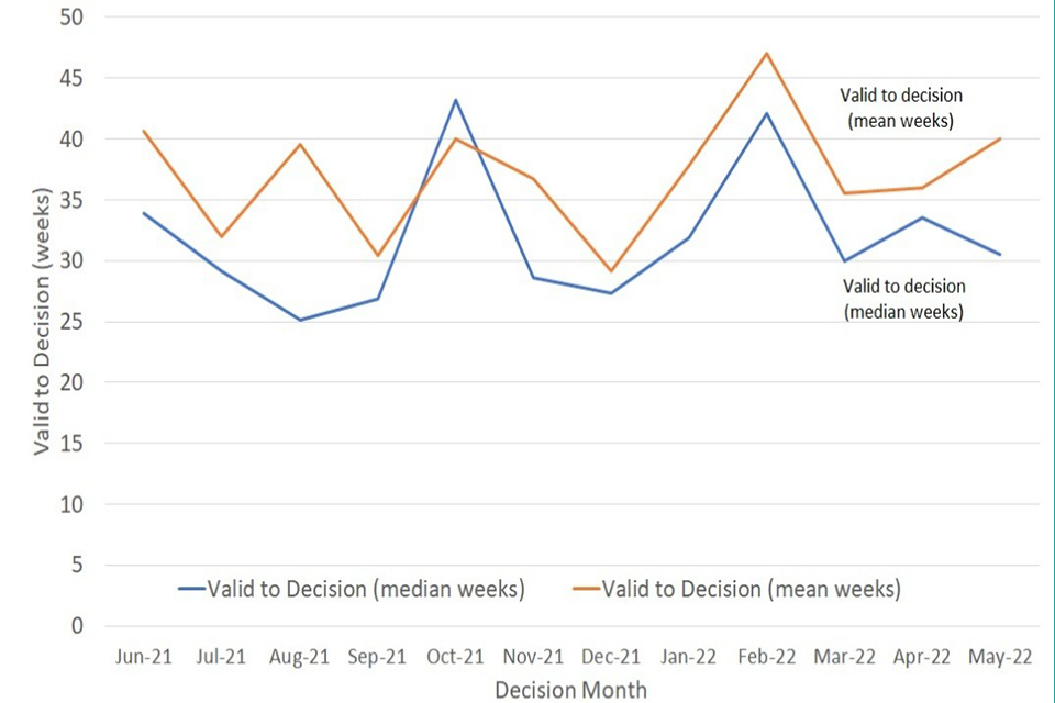Table 5 below shows that the median time to make a decision, across all cases in the last 12 months, was 25 weeks. Figure 5 shows the median has been above 21 weeks for the last 12 months; and has generally been higher since August 21.