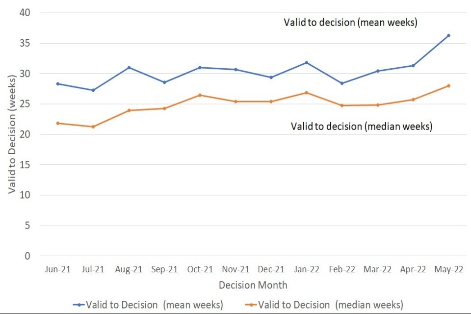 The median time to decide a case during May 2022 was 28 weeks, 2.3 weeks higher than April 2022. The median time to decide was around 22 weeks at the start of the reporting period, and has been 24 – 27 weeks over the past 9 months.