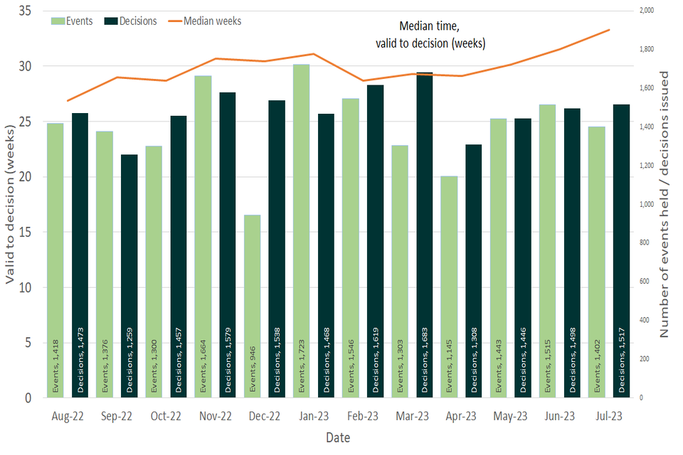 Figure 1: Number of events held , decisions issued and median time between valid date & decision date; August 2022 to July 2023