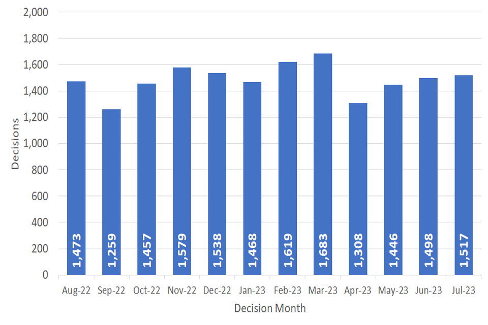 The number of decisions issued in July 2023 was 1,517, with a monthly average of 1,510 over the past 12 months.