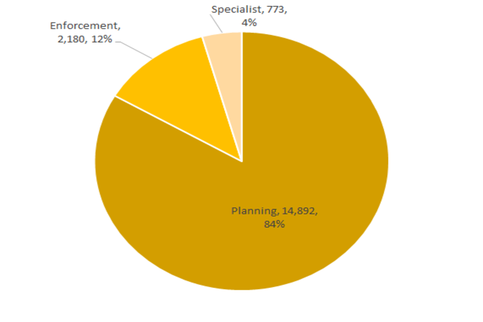 The large majority of cases over the past 12 months were planning (14,892). This is about 83% of all appeal decisions made. There were 2,180 enforcement decisions and 773 specialist decisions. These totals are also shown in Table 4 above and Figure 4 below.