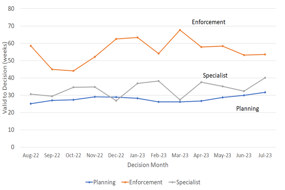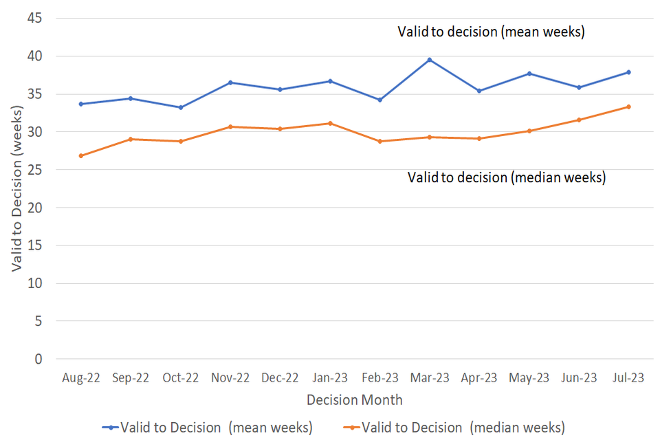 The median valid to decision time was 33 weeks in July 2023, as seen in Figure 1 and Table 1 below. This has increased in recent months, driven by higher decision times for planning appeals decided through written representation. This is due to an increased focus on the oldest cases of this type.