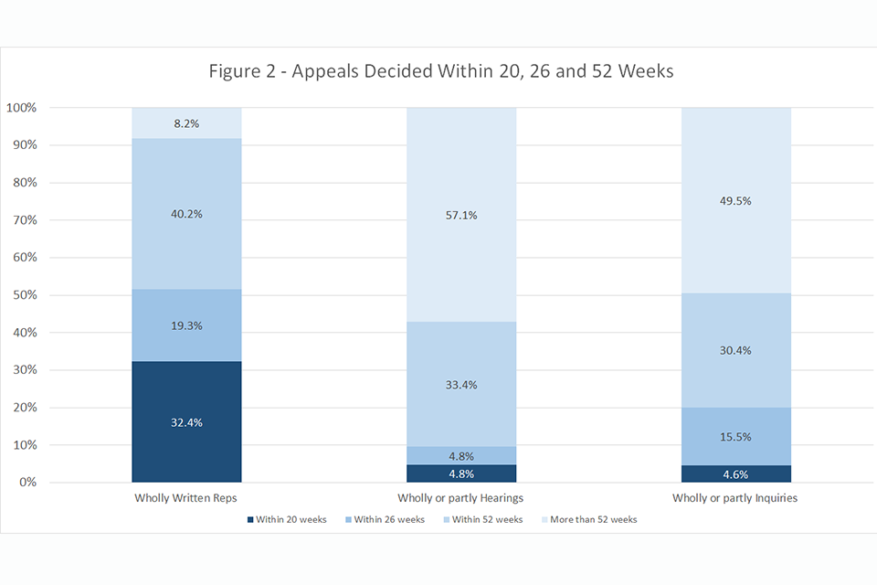 Figure 2 shows how many cases are decided within a year, and how many take longer than a year. It shows that a much smaller proportion of cases decided by written representations take more than a year (8.2% more than 52 weeks) than those decided by Hearings (57.1% take more than 52 weeks) or Inquiries (49.5% take more than 52 weeks).