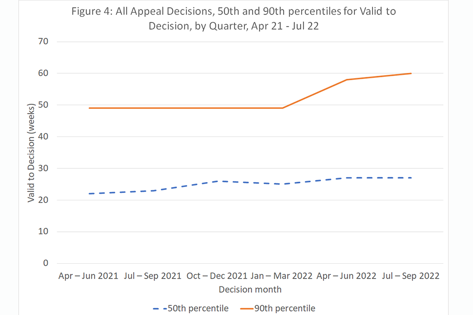 Annex F - Appeal Decisions, 50th and 90th percentiles of Valid to Decision (weeks), April 2021 to Sep 2022 - by procedure