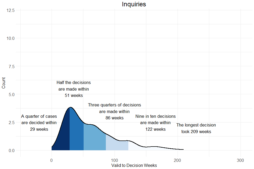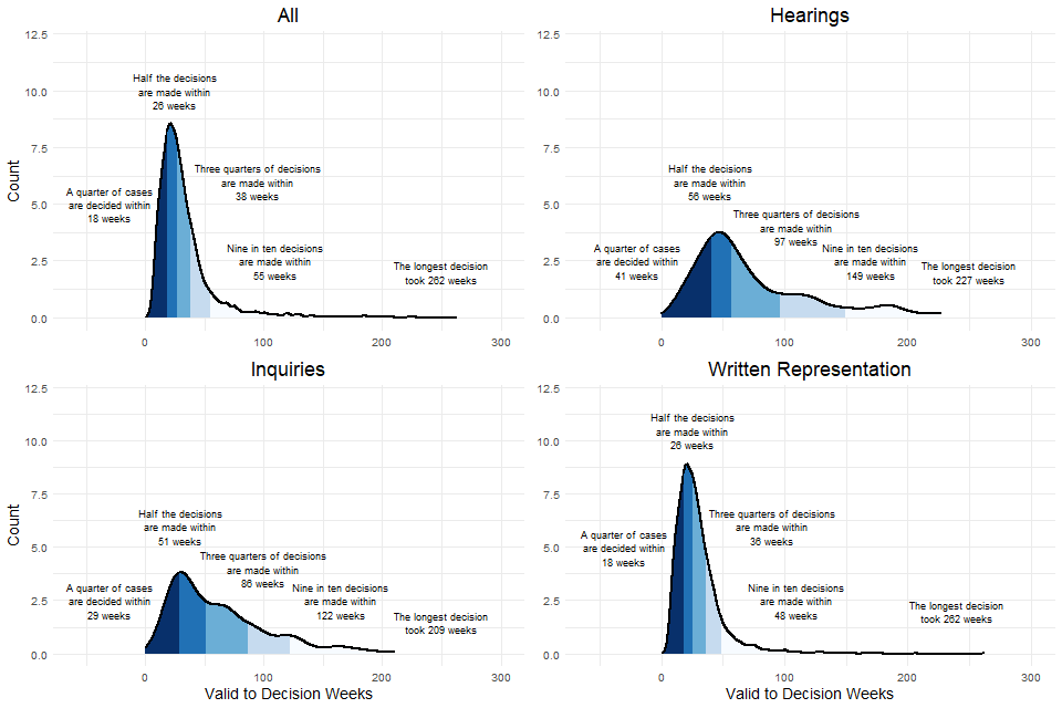 - For all procedure types, there are a small number of cases that take over four years (200 weeks and more) – two decided through written representations, two through inquiries, 16 through hearings.