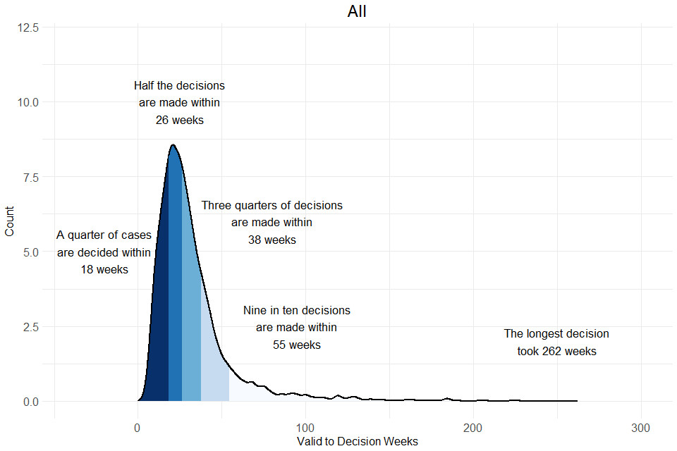 Figure 3 below shows more detail. It gives the full spread of time taken to decide cases, providing visibility of those case far outside the accepted range. It shows all cases decided in the 12 months to the end of October 2022; and a breakdown by the decision procedure. Larger pictures are available at Annex D.