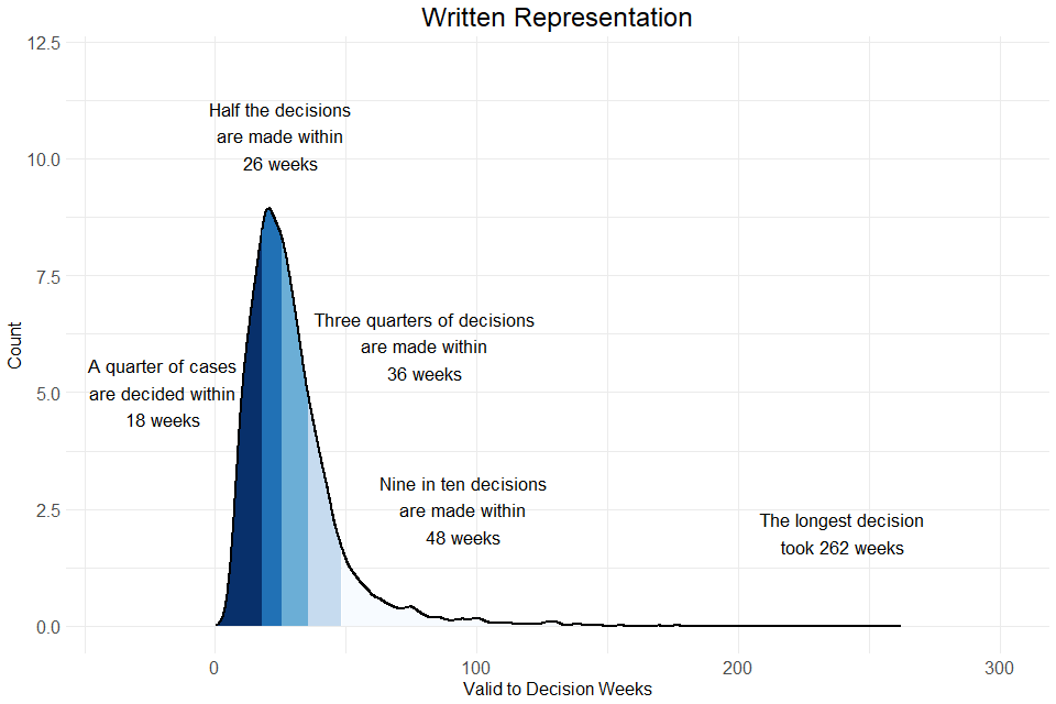 - The spread of time taken to decide for all cases, is similar to the spread for those decided wholly by written representations. This is because the large majority (16,301/17,455) of cases are decided this way.