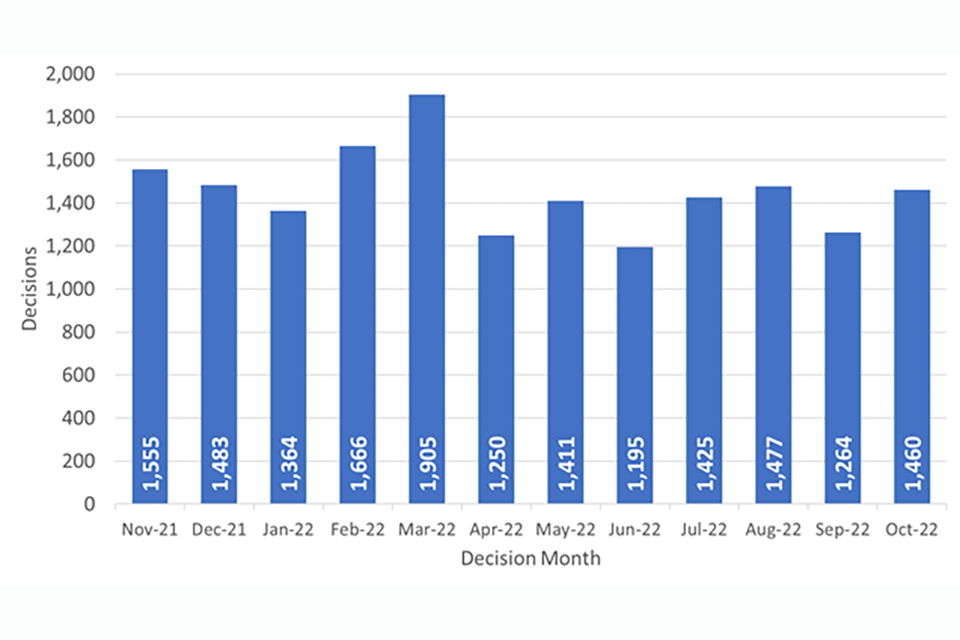 The number of decisions issued in October 2022 was 1,460, just over the average of 1,455 decisions per month over the past 12 months.