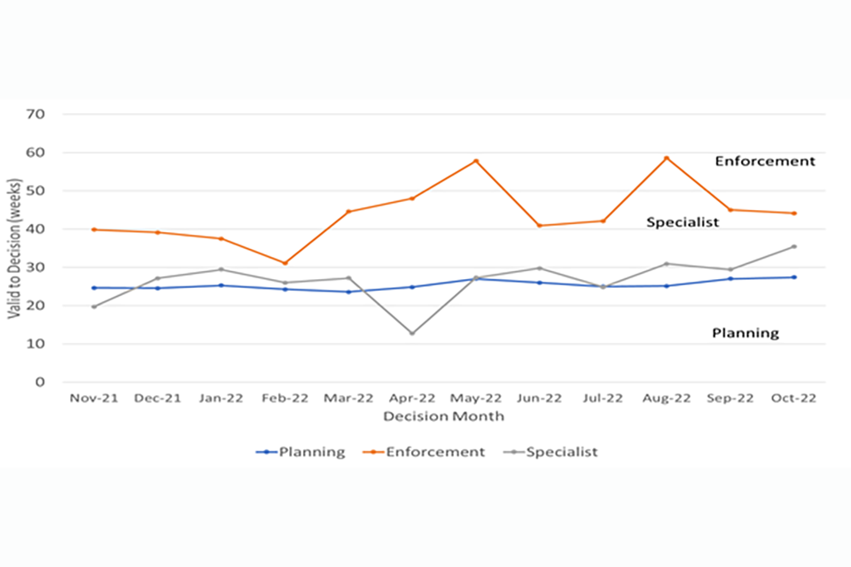 The median decision time for cases decided in October 2022 was 29 weeks. This is one of the longest observed in the last 12 months and is driven by longer decision times for the cases answered by written representation. Decisions on hearings and inquiries saw the lowest monthly median of the past 12 months in October.