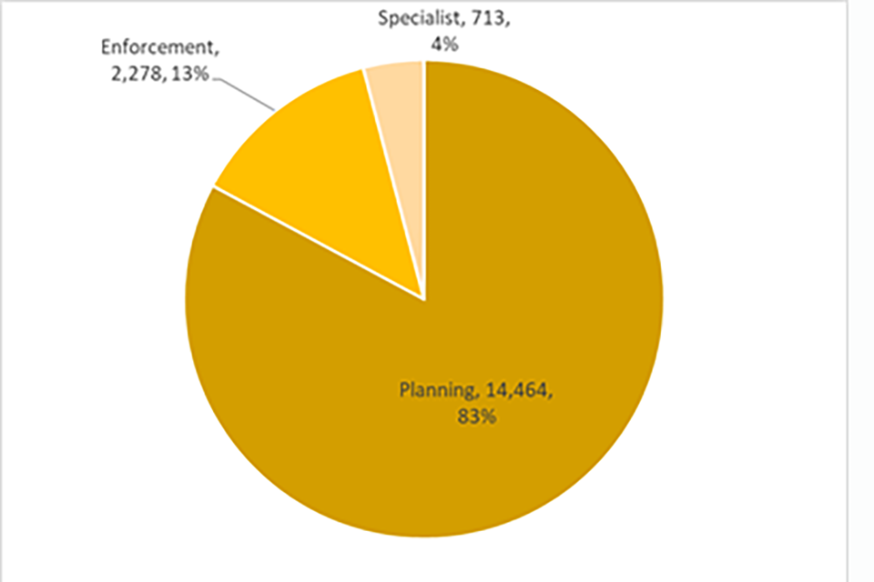 The large majority of cases were planning (14,464). This is about eighty-three per cent of all appeal decisions made. There were 2,278 enforcement decisions and 713 specialist decisions. These totals are also shown in Table 4 above and Figure 4 below.