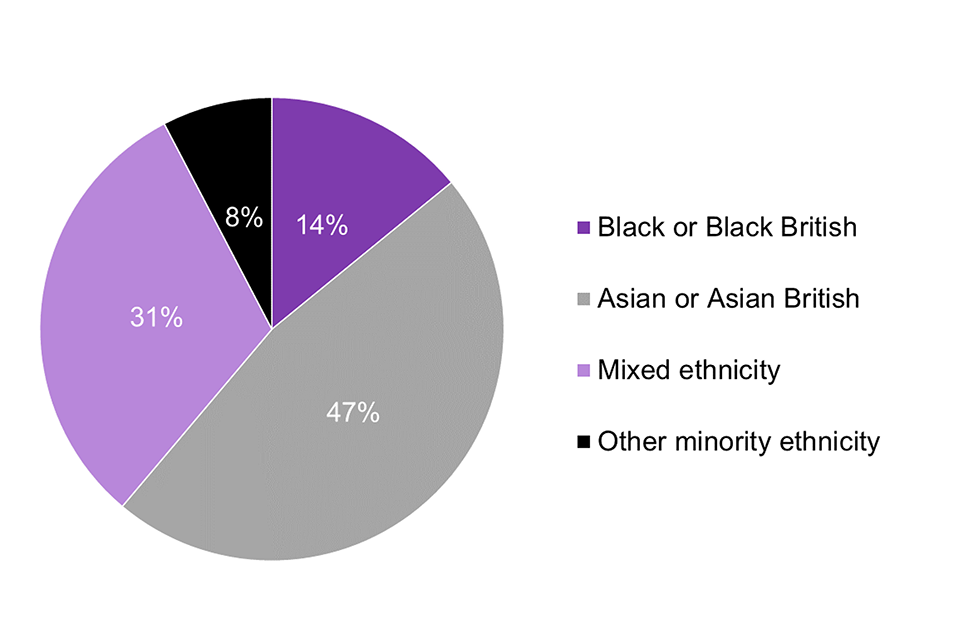 Figure 3.4 shows that, of new recruits that self-defined their ethnicity as other than White, 47% identified as Asian, 31% as Mixed, 14% as Black and the remaining 8% as Other. By comparison, the 2011 census showed that of those who identified as Black, Asian, Mixed or Other ethnic, 54% identified as Asian, 16% as Mixed, 24% as Black and 7% as Other.