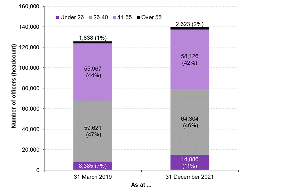 Further information on the age of police staff and a historic time series of police officer by age group can be found in the annual workforce statistics for the year ending 31 March 2021.