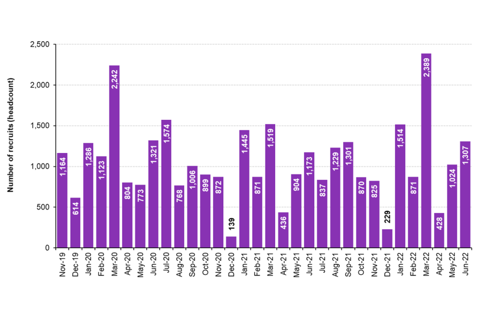 Figure 1 shows, by month, a steady increase in the number of police officers recruited towards the target of 20,000 by March 2023. Officer recruitment levels vary by month, reflecting the different recruitment cycles of individual forces as well as seasonal patterns. Following the end of the financial year in March, officer numbers declined in April 2022, followed by increases in May and June 2022. The net effect of this is an increase of 234 uplift officers compared with March 2022.