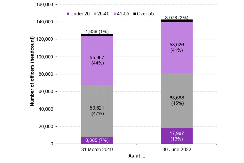 Following improvements to the completeness of the data, the proportions of both total officers and new joiners since April 2020 have been broken down by age group in the diversity section of these official statistics. As at June 2022, all officers had recorded their age on police force HR systems.
