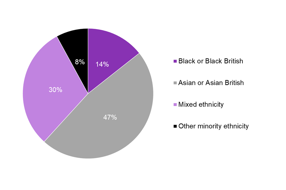 Figure 3.4 shows that, of new recruits that self-defined their ethnicity as an ethnic minority (excluding white minorities), 47.4% identified as Asian, 30.3% as Mixed, 14.3% as Black and the remaining 7.9% as Other. By comparison, the 2011 Census showed that of those who identified as an ethnic minority (excluding white minorities) 54% identified as Asian, 16% as Mixed, 24% as Black and 7% as Other.