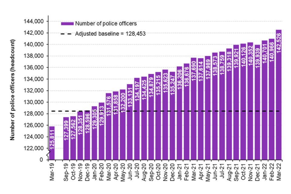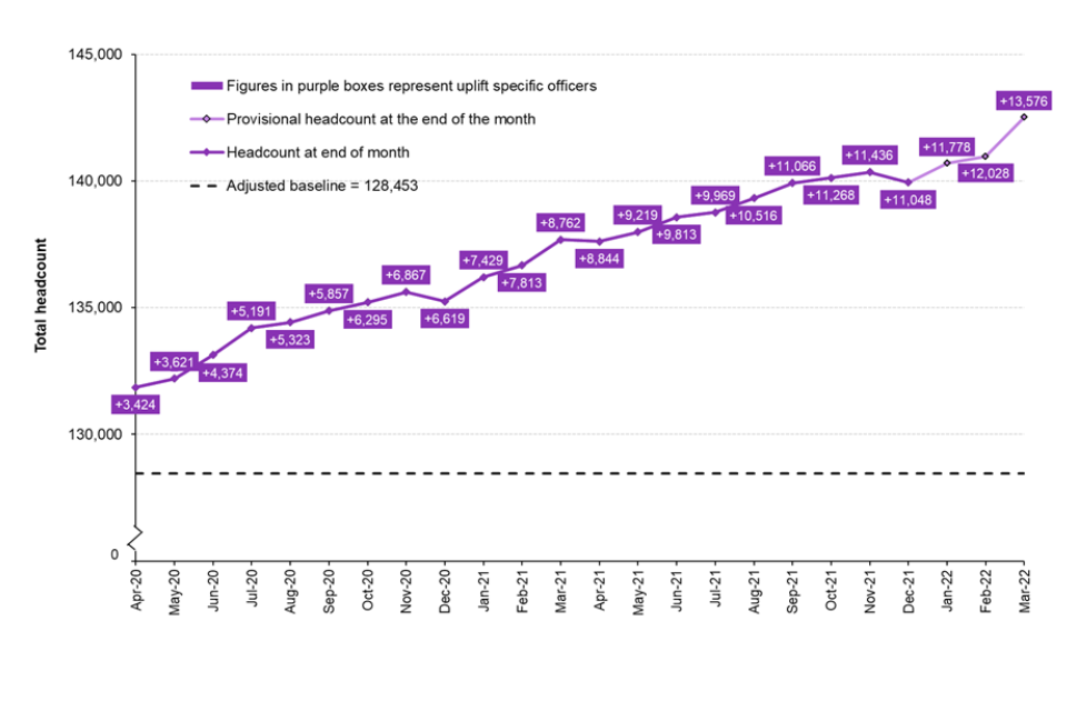 As at 31 March 2022, provisional data show that there were 142,526 officers in the 43 territorial police forces in England and Wales. This is an increase of 14,073 officers against the adjusted baseline (128,453). Of these additional officers, 13,576 can be attributed to the uplift programme (a 11% increase on the adjusted baseline), and the remaining 497 through local funding (see chapter 2 for further details).