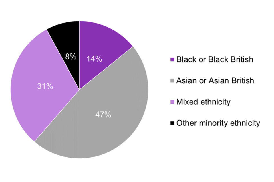 Figure 3.4 shows that, of new recruits that self-defined their ethnicity as an ethnic minority (excluding white minorities), 47.2% identified as Asian, 30.7% as Mixed, 14.2% as Black and the remaining 7.9% as Other. By comparison, the 2011 Census showed that of those who identified as an ethnic minority (excluding white minorities) 54% identified as Asian, 16% as Mixed, 24% as Black and 7% as Other.