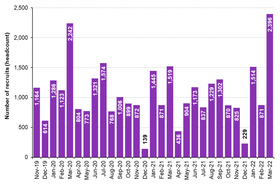 Figure 1 shows, by month, a steady increase in the number of police officers recruited towards the target of 20,000 by March 2023. In the latest quarter, the total number of officers recruited towards uplift increased each month (January, February and March), following a slight decline in December 2021. Particularly strong growth in police officer headcount was seen in March 2022, where the headcount increased by 1,560 compared with February 2022, the second largest month-on-month increase since the programme began. Officer recruitment levels vary by month reflecting the different recruitment cycles of individual forces.