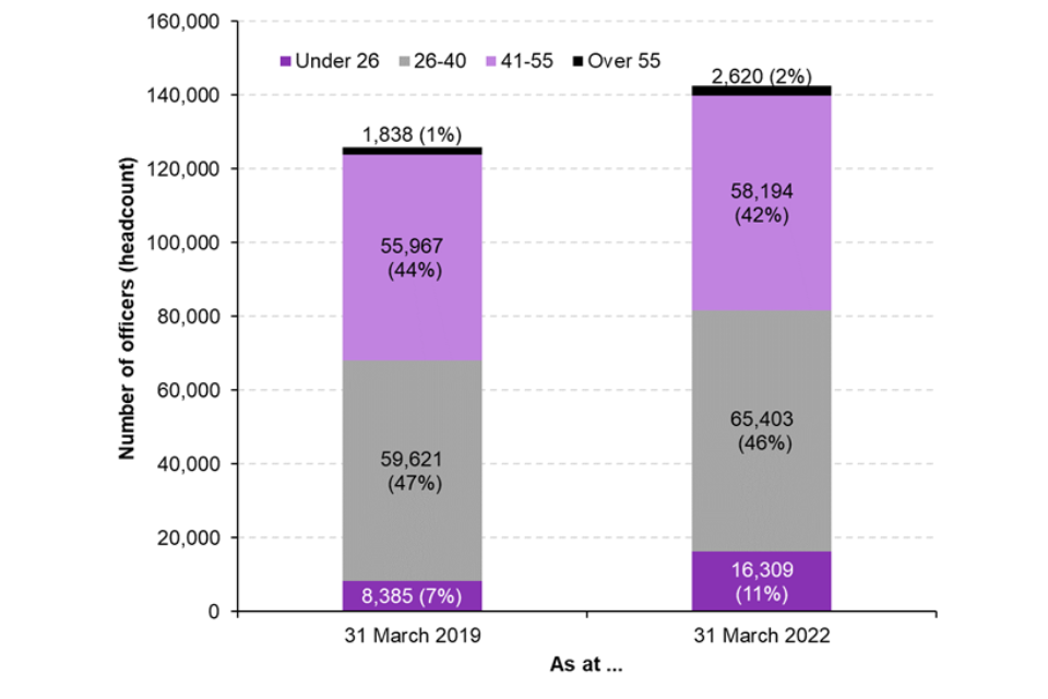 Since April 2020, 94.7% of all new police officer recruits were aged 40 or under (and 54.7% of new recruits were under 26). Only 0.2% of new recruits were over the age of 55.