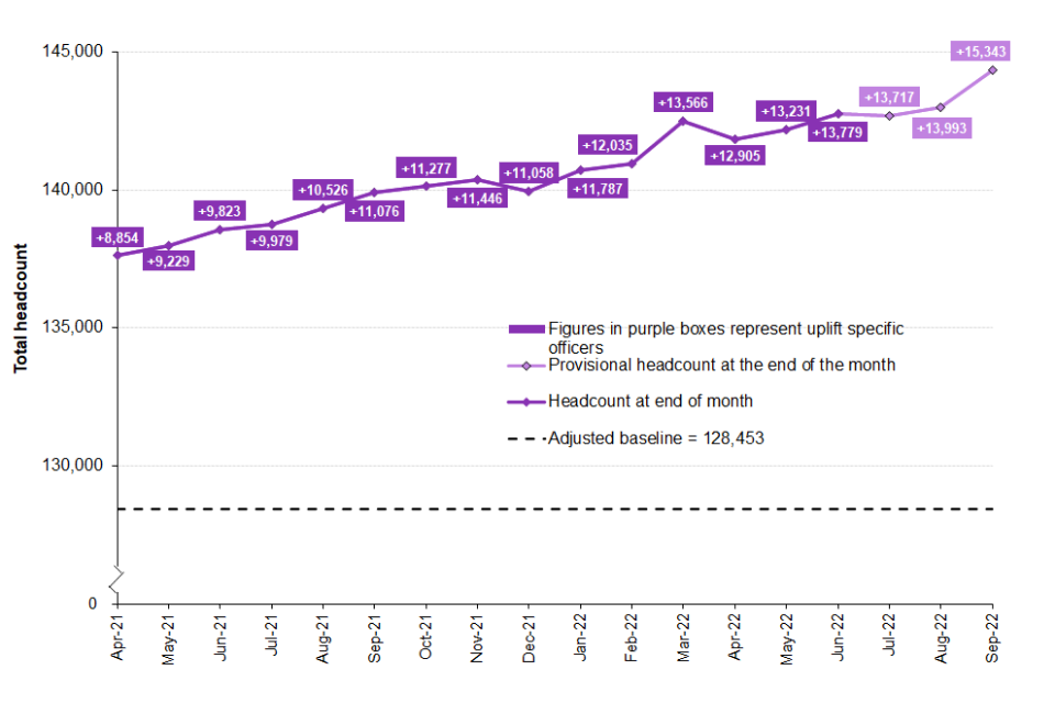 As at 30 September 2022, provisional data show that there were 144,356 officers in the 43 territorial police forces in England and Wales. This is an increase of 15,903 officers against the adjusted baseline (128,453). Of these additional officers, 15,343 can be attributed to the uplift programme (a 12% increase on the adjusted baseline), and the remaining 560 through local funding (see chapter 2 for further details).