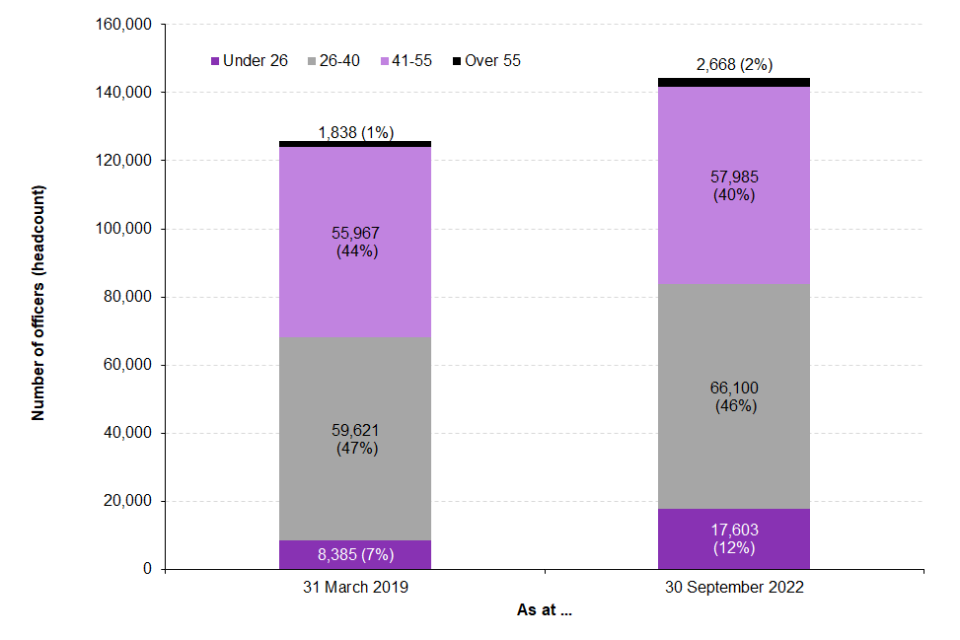 Since April 2020, 94.9% of all new police officer recruits were aged 40 or under (and 55.8% of new recruits were under 26). Only 0.2% of new recruits were over the age of 55.