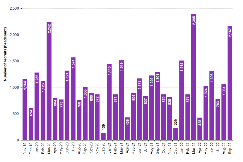 Figure 1 shows, by month, a steady increase in the number of police officers recruited towards the target of 20,000 by March 2023. Officer recruitment levels vary by month, reflecting the different recruitment cycles of individual forces as well as seasonal patterns. Over the latest quarter, between July and September 2022, there was a net increase of 1,564 uplift officers compared with June 2022. The majority of this increase was seen in the month of September 2022.