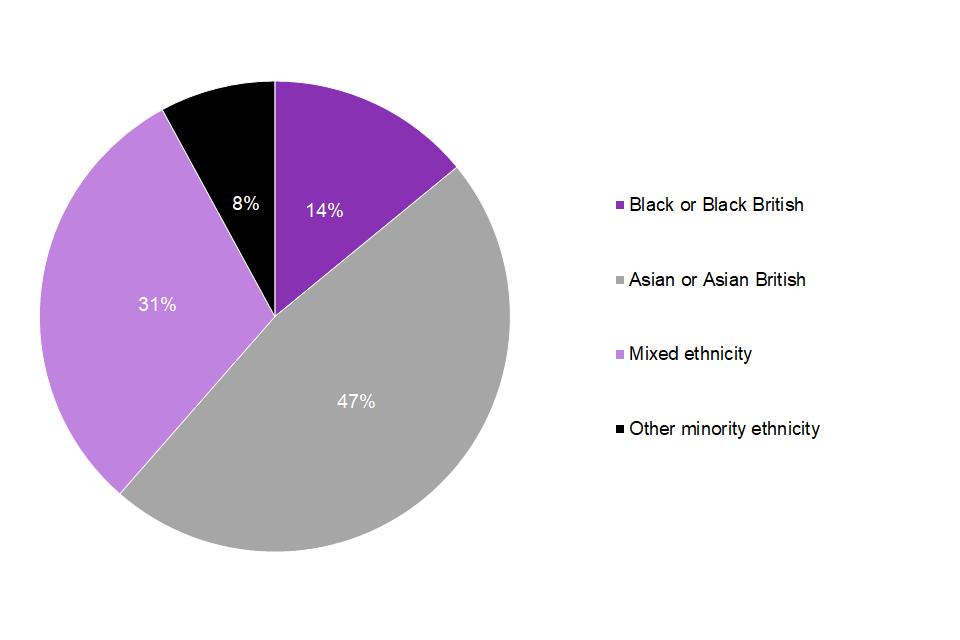 Figure 3.4 shows that, of new recruits that self-defined their ethnicity as an ethnic minority (excluding white minorities), 47.4% identified as Asian, 30.6% as Mixed, 14.1% as Black and the remaining 7.9% as Other. By comparison, the 2011 Census showed that of those who identified as an ethnic minority (excluding white minorities) 54% identified as Asian, 16% as Mixed, 24% as Black and 7% as Other.