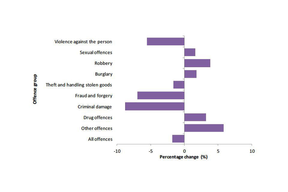Arrests by offence group, England and Wales, change between 2009/10 and 2010/11
