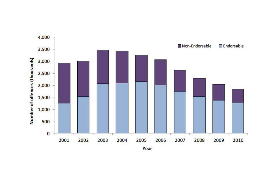 Trend in endorsable and non-endorsable fixed penalty notices, 2001 to 2010