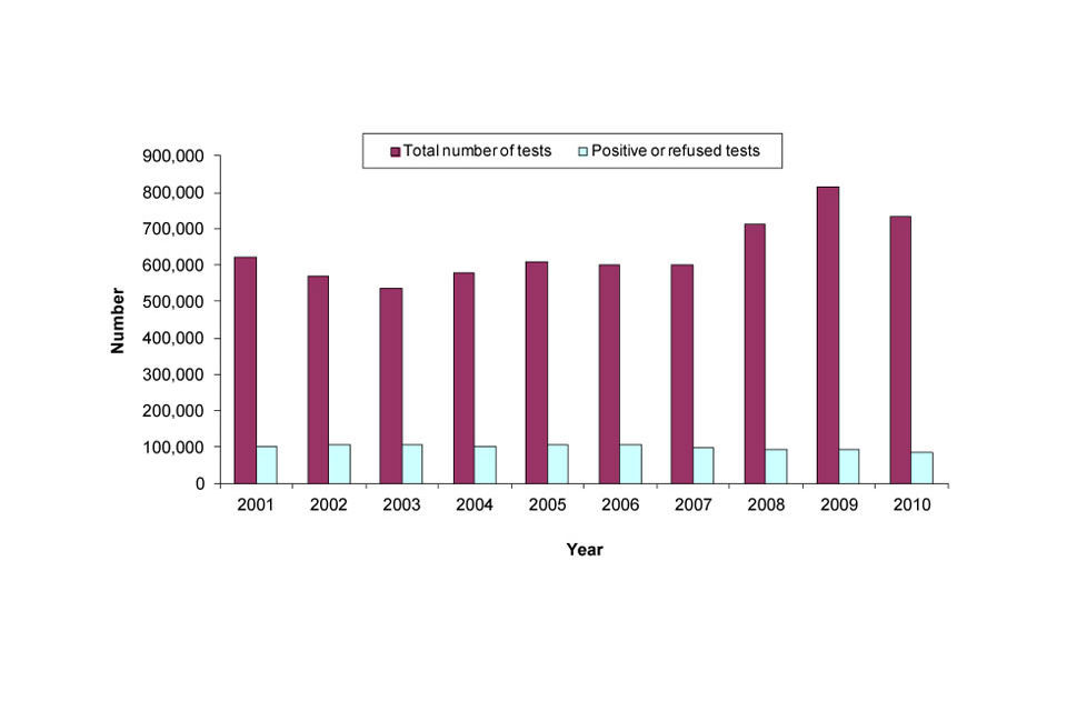 The number of positive or refused tests in 2010 also decreased by ten per cent, from 93,232 in 2009 to 83,932 in 2010.