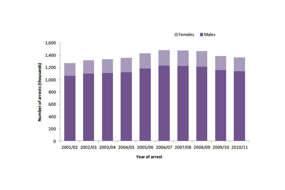Arrests of males and females both fell in 2010/11, with male arrests decreasing by 12,976 (1%) to 1,140,497, and female arrests decreasing by 11,895 (5%) to 219,954.