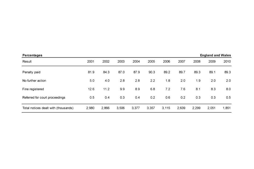 Eighty-nine per cent of the FPNs issued by the police in 2010 were paid, while a fine was automatically registered at court for a further 8 per cent. The proportion of both of these outcomes has remained relatively stable since 2005.